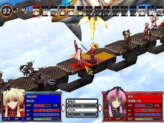 戰(zhàn)斗要點(diǎn):開始千雨和天使全退到機(jī)甲后面加狀態(tài),引小怪進(jìn)入打機(jī)甲攻擊范圍殺之。然后慢慢引戰(zhàn)爵(戰(zhàn)爵攻擊范圍5格)下來打。第3回合我方2隊(duì)人馬參戰(zhàn)支援,輕松做掉戰(zhàn)爵。