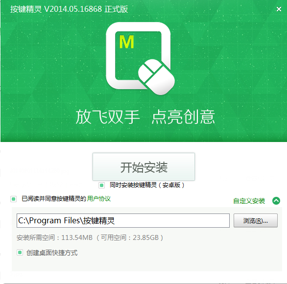 1、下載按鍵精靈綠色版安裝包,可選擇自定義安裝目錄、是否同時安裝按鍵精靈安卓版等。
