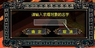 四、其次點(diǎn)擊“輸入求婚對(duì)象”的游戲名字。輸入求婚對(duì)象名字后,鼠標(biāo)單擊確定,等待對(duì)方應(yīng)答。
