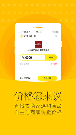 - [搜索商家]- 展示與安團(tuán)簽約砍價(jià)師服務(wù)的商家,讓您在百忙中不必一家家跑,打開手機(jī)APP,一家家選擇,一家家看看。真正在家里挑選自己喜歡的品牌。