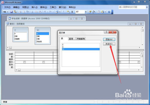 在“顯示表”窗口中把我們需要用的表添加進(jìn)去。小編這里要查詢課程編號(hào)CNO、課程名稱CNAME以及學(xué)生的均分GRADE,所以這里添加C表和SC表即可。添加完成單擊“關(guān)閉”按鈕關(guān)閉“顯示表”窗口。