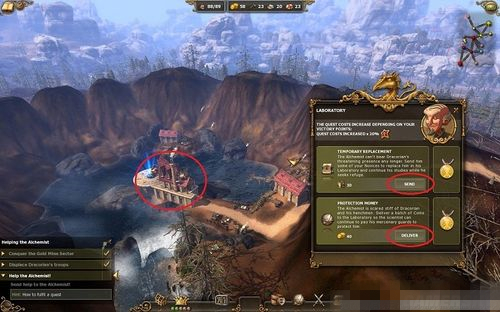 有金礦的領(lǐng)地就在出生點(diǎn)的上方,點(diǎn)一下敵人的營(yíng)地就會(huì)看到上圖所示的面板 移動(dòng)到Delive上,可以看到價(jià)格是30單位金錢(qián),點(diǎn)擊一下,你的貿(mào)易辦公室的小販