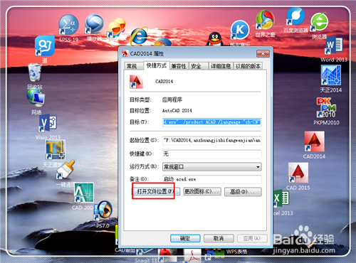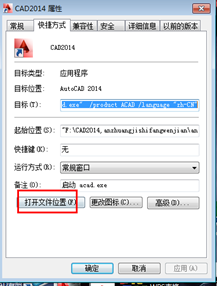 5.進(jìn)入到CAD2014的屬性界面,點(diǎn)擊左下方的“打開文件夾位置”,找到安裝文件夾。不建議慢慢去找,也許忘記了安裝在哪個磁盤,這個方式是最有效最快捷的。