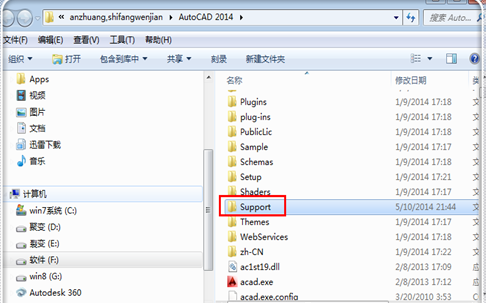 6.進(jìn)入CAD2014安裝文件夾(你的版本也是一樣的),點(diǎn)擊“support”文件夾進(jìn)入。
