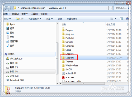 4、進(jìn)入CAD2014安裝文件夾(你的版本也是一樣的),點(diǎn)擊“support”文件夾進(jìn)入。