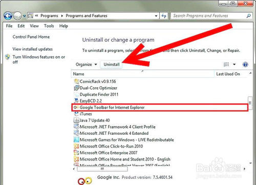 定位低于谷歌Internet Explorer工具欄列表中的“程序和功能”。啟動“卸載”選項。