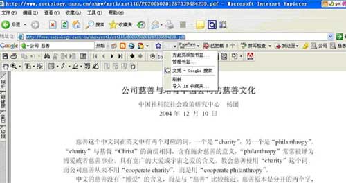 比如,我們想了解公司慈善方面的東西。在工具條中,輸入搜索詞"公司 慈善",我們用"手氣不錯"來搜索,直接就進(jìn)入了一個PDF網(wǎng)頁,這是中國社科院長達(dá)12頁的關(guān)于"公司慈善和培育中國公司的慈善文化"的一個研究文章。想留下來,好好讀嗎?打開"書簽",為此頁添加書簽,就可以了。