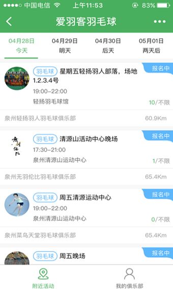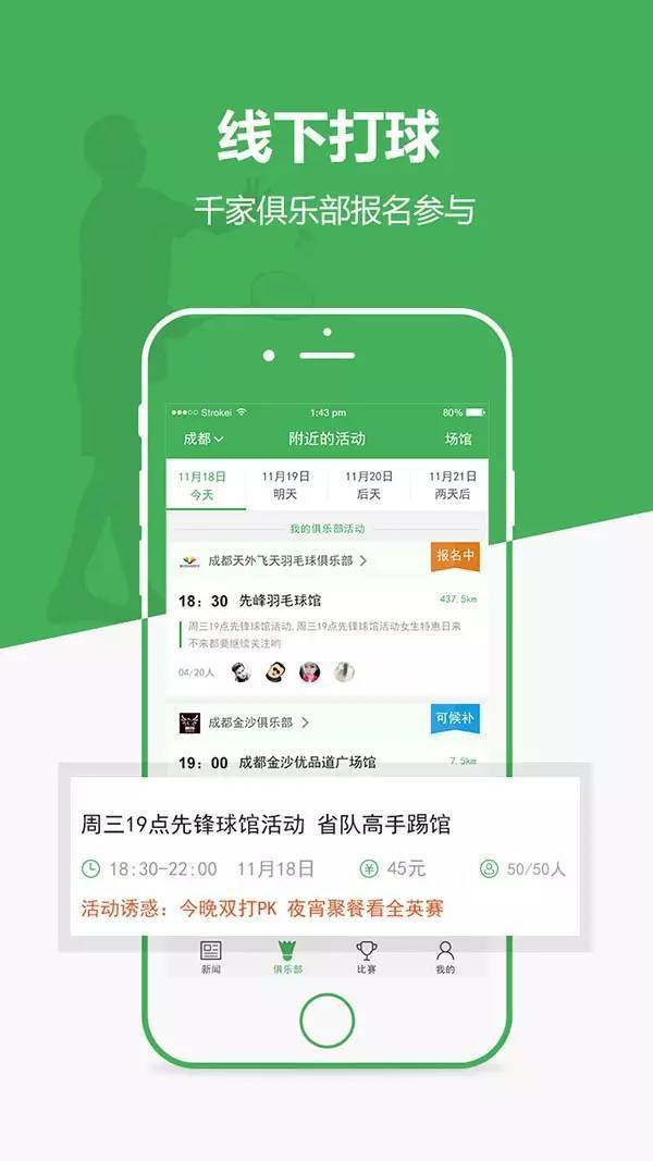 千余家羽毛球俱樂部入駐愛羽客體育社。查看附近所有俱樂部打球活動,在線報名打球,在線結(jié)算費用更便捷。