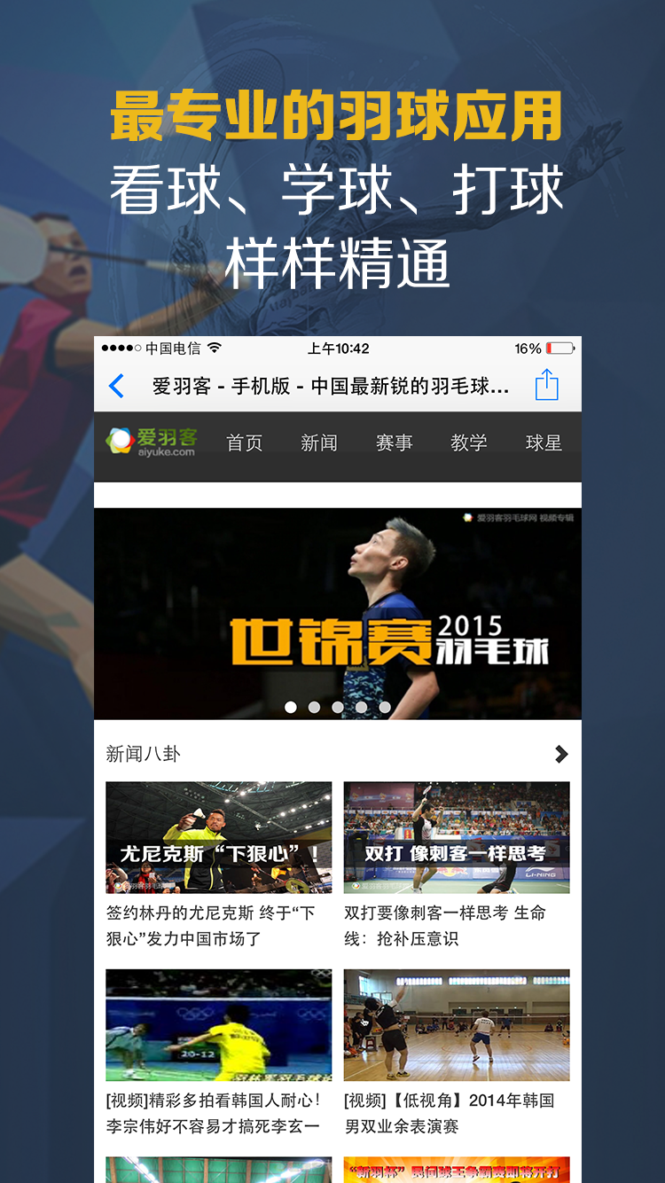 羽毛球愛好者的必備利器,國內(nèi)專業(yè)的愛羽客羽毛球網(wǎng)官方APP??辞颉W球、打球統(tǒng)統(tǒng)搞定!
