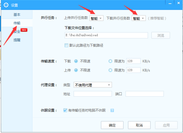 進入設(shè)置以后在左列表選擇“傳輸”選項,即可在左選項欄第一項操作下載和上傳的數(shù)量,默認值為智能,下載數(shù)量為1-5,如下圖: