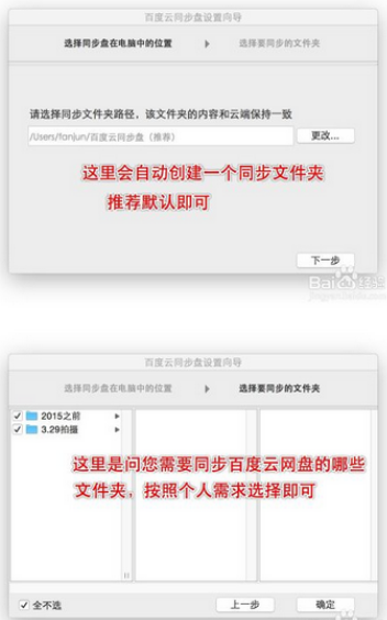 需要在本機創(chuàng)建一個百度云盤的文件夾,推薦默認即可,點擊下一步,選擇需要網(wǎng)盤同步到電腦中的文件夾,不勾選不會同步。