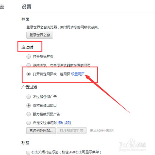然后再向上拉,找到【啟動時】選擇【打開特定網(wǎng)頁或者一組網(wǎng)頁】