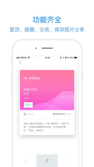 基本的節(jié)點記錄功能外,還有天數(shù)計算、日期推算等相關(guān)功能。還可以生成精美圖片,多渠道多方式轉(zhuǎn)發(fā)分享,是一款簡潔美觀、小巧實用的日期管理app。