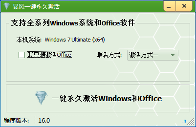 1、暴風激活工具隨著Windows10系統(tǒng)的普及,最近新添加針對Windows10系統(tǒng)的激活和最新版Office軟件的激活功能.2、暴風激活工具一鍵永久激活win7系統(tǒng),win8系統(tǒng),win8.1系統(tǒng),win10系統(tǒng)和各系列的Office軟件的激活問題,輕松 一鍵就可以實現(xiàn)永久完美離線激活,完全超越其他任何激活工具.
