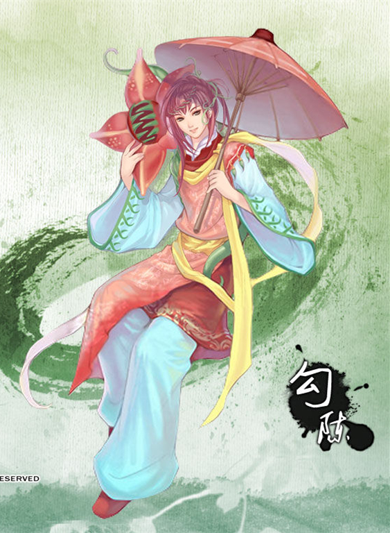 勾陳:原為上古六神之一。俊秀瑰麗、俏美如花、巧笑吟吟、個性飄忽、時笑時嗔、時善時惡、男女莫辨。美麗的笑顏下隱藏著深不可測的實力,與句芒長相近似,兩人似乎有某種程度的關(guān)系,別號“緋花修羅”。