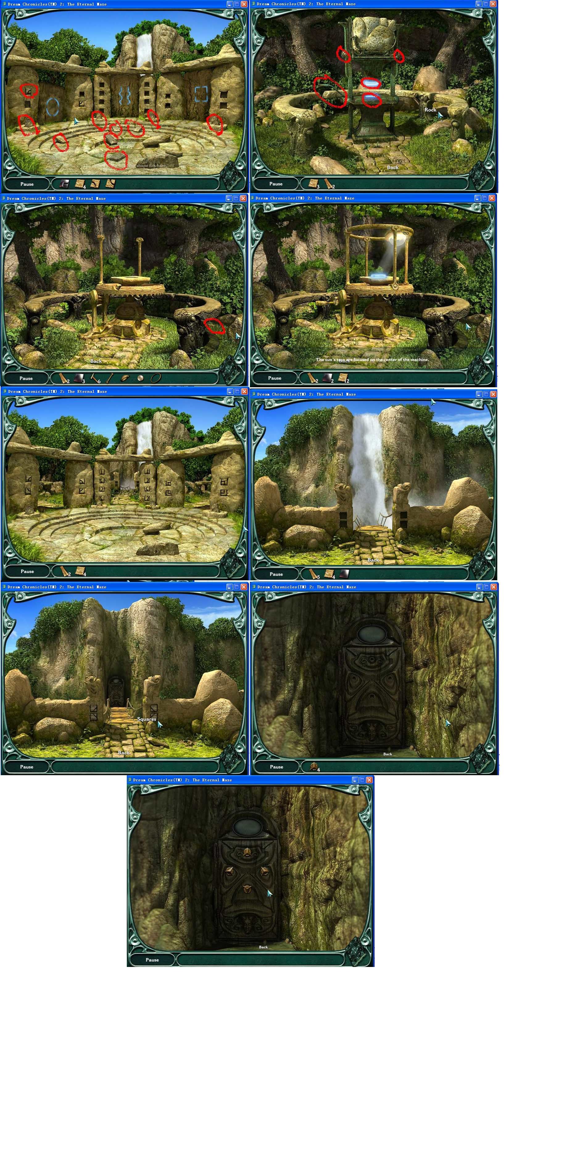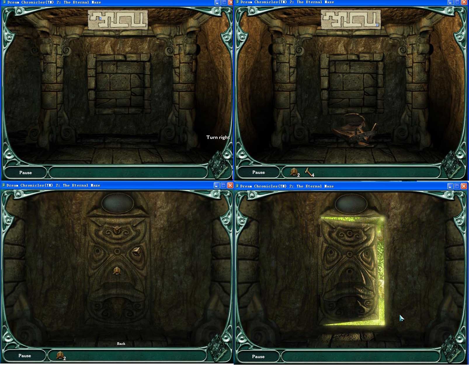 第三關(guān),左右兩個門石塊的圖案被打亂,取下來重新拼,然后水塘里出現(xiàn)多個石頭,選擇正確的路線就可以到中間那個門,錯了可以重選。中間門的圖案隨便點點就可以拼對,汗