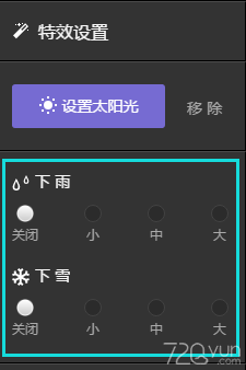 點(diǎn)擊特效,在藍(lán)色框處選擇小/中/大直接開啟雨或雪特效與特效強(qiáng)弱