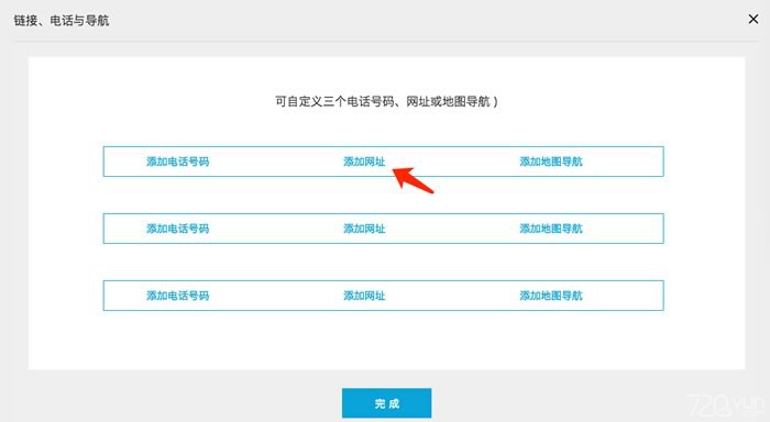 5.轉(zhuǎn)到720yun中,打開作品編輯頁(yè)中的“電話、鏈接與導(dǎo)航”功能,點(diǎn)擊“電話”按鈕,在輸入框中填入剛才復(fù)制的那串地址,點(diǎn)擊“完成”按鈕即可完成相關(guān)設(shè)置。(網(wǎng)站與桌面客戶端通用)。