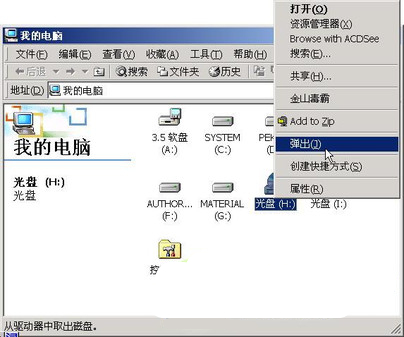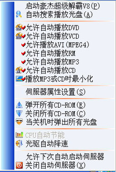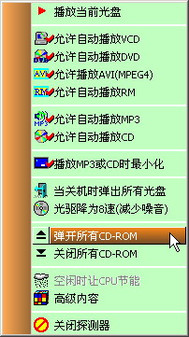 盡管在Windows的資源管理器中可以右擊光盤,并選擇"彈出"命令,將光驅(qū)中的光盤彈出(如圖3),但是卻沒有一個"進(jìn)倉"命令關(guān)上CD盒,這不得不說是Windows的一個Bug.不過,筆者在使用超級解霸自動伺服器的過程中發(fā)現(xiàn),它可以起到一個CDROM驅(qū)動器的軟件開關(guān)作用.具體的方法是:安裝完《超級解霸》后,右擊任務(wù)欄上的系統(tǒng)伺服器圖標(biāo),在彈出如圖4所示的菜單中選擇"彈開所有CD-ROM"命令,就可以將本機上的所有CD-ROM(不包括刻錄光驅(qū)CD-RW等設(shè)備)的光驅(qū)盒蓋打開,供您進(jìn)盤,如果您要關(guān)閉盒蓋,只要再次選擇"關(guān)閉所有CD-ROM"菜單即可.這樣使用起來一來比較方便,二來減少了硬件的損壞,真是一舉兩得.
