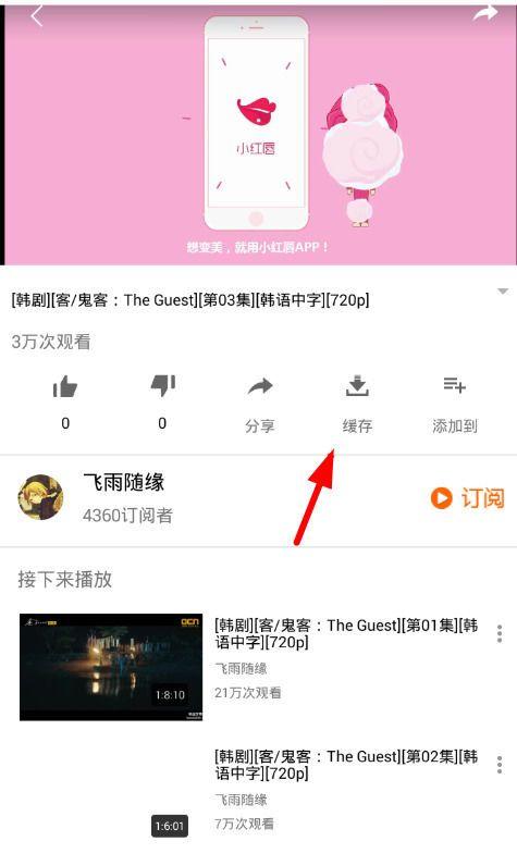 2、接下來(lái)在視頻的播放頁(yè)面里,直接點(diǎn)擊播放列表里的“緩存”按鈕,就可以將該視頻下載到手機(jī)本地了。