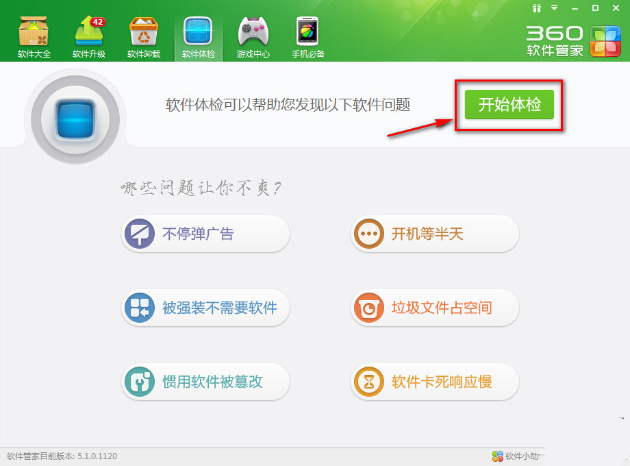 2.在“軟件體檢”界面點擊“開始體檢”按鈕開始對您的電腦中安裝的軟件進(jìn)行體檢,