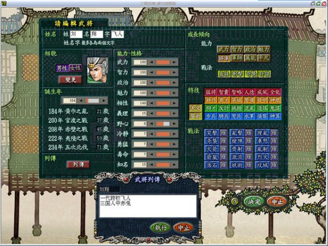 一般來(lái)說(shuō),能力高的名將(如劉關(guān)張、張遼、趙云)12內(nèi)年是一定可以把所有的能力值提到95以上(武力、智力、魅力絕對(duì)是100),并學(xué)會(huì)所有的特技和戰(zhàn)法。渣渣武將需25年以上(如蔡和,馬玩)。這里說(shuō)一下,打劉關(guān)張是最容易的,因?yàn)槌跏紬l件好,與華佗、司馬徽關(guān)系好搞(張飛可是萬(wàn)能型武將,鍛煉起來(lái)快得很),初學(xué)者可選選。