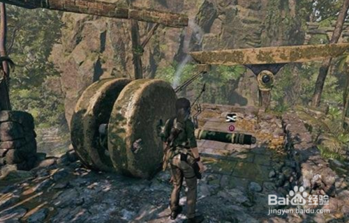 3、玩家需要上平臺(tái),在轉(zhuǎn)軸處用繩索箭矢將遺跡內(nèi)的轉(zhuǎn)軸與外面的轉(zhuǎn)軸連上。遺跡內(nèi)的機(jī)器開(kāi)始轉(zhuǎn)動(dòng)。
