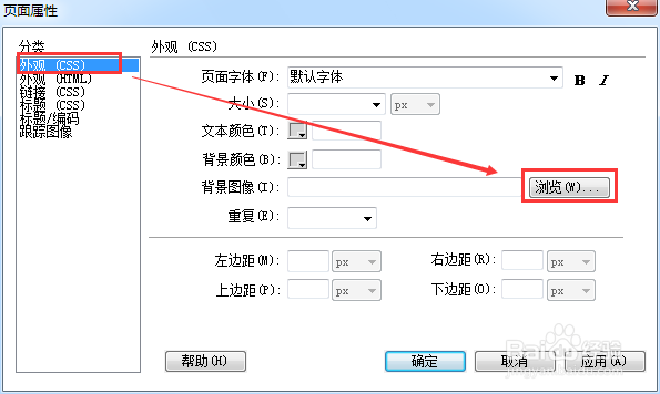 打開頁面屬性后,選擇外觀分類,然后點擊背景圖像后面的瀏覽,選擇背景圖片,如下圖所示。