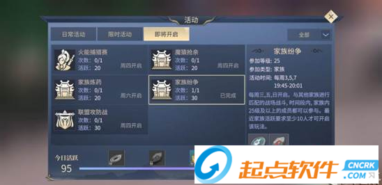 “家族紛爭”玩法是在每周的3、5、7晚上的19:45~20:01開啟,活動時間內(nèi)有1分鐘的準備時間和15分鐘的進攻時間。活動時間段內(nèi),家族中25級及以上的成員都可以參與,而正常來說,斗者第一天創(chuàng)建角色只要完成當天所有任務(wù)即可輕松達到26-27級,所以這個等級門檻可以算是比較低的。
