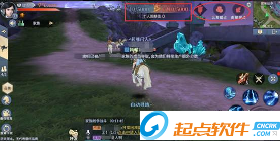 在活動地圖內(nèi),我們可以在界面的右上角看見“北部據(jù)點”、“南部據(jù)點”和中間“戰(zhàn)旗”的圖標,點擊圖標可以直接尋路前往。同時,這里也可以非常直觀的查看到它們的被占領(lǐng)情況。在屏幕的中上方顯示的則是個人的貢獻值,和雙方家族的比分情況,活動時間內(nèi),任意一方家族積分率先達到5000便判定為獲勝。