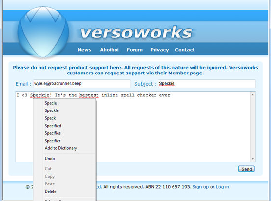 Speckie 是IE瀏覽器的一個輔助工具,能為IE瀏覽器添加實時的拼寫檢查功能。當單詞輸入錯誤時,單詞下會有紅色下劃線,此時只要在單詞上右鍵鼠標可看到正確單詞的提示,該工具完全支持IE9。