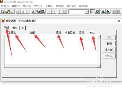 在彈出的“表設(shè)計器”中,選擇“字段”選項,輸入字段名,設(shè)置字符類型、寬度、排序方式