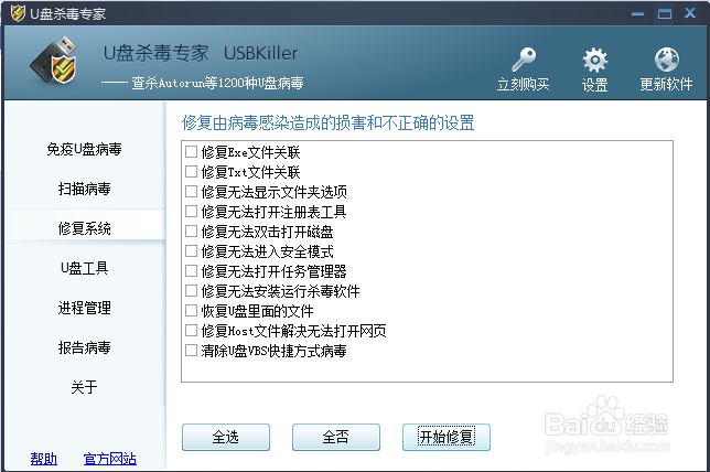4、打開主界面后,在左側單擊修復系統(tǒng),選擇“全選”,點擊“開始修復”就可以使文件或數(shù)據(jù)恢復到原有的設置了。可以修復“無法顯示隱藏文件或文件夾”、“雙擊不能打開磁盤”和“U盤無法運行殺毒軟件”等情況。