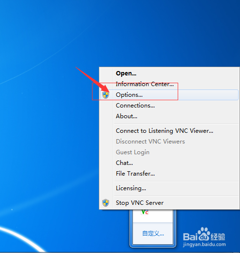 安裝好VNC后在電腦右下角找到VNC圖標,右鍵點擊選擇“OPTIONS”
