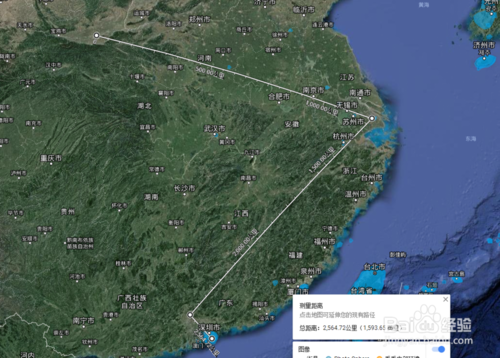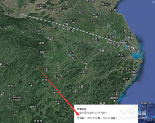 然后,在地圖上點(diǎn)一下起點(diǎn)和終點(diǎn)位置,如西安到上海的直線距離,顯示在最下方是1217.59公里,上方標(biāo)尺處也有寫(xiě)明