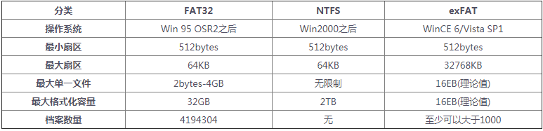 NTFS、FAT32、exFAT區(qū)別NTFS、FAT32、exFAT是我們使用電腦最常見的分區(qū)了,它們之間有什么區(qū)別呢。 NTFS、FAT32、exFAT一個(gè)比較概念性的東西,建議如果是移動(dòng)硬盤就算則NTFS,如果是U盤等采用exFAT閃存為介質(zhì)的存儲(chǔ)設(shè)備,exFAT或者兼容性的FAT32比較好,下面小編就來給大家分析NTFS、FAT32、exFAT區(qū)別。如下圖:
