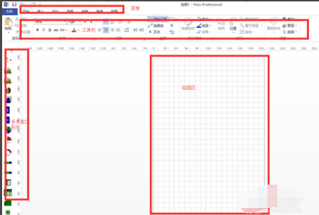打開office visio2007界面:【菜單】【工具欄】【任務(wù)窗口】【繪圖區(qū)】