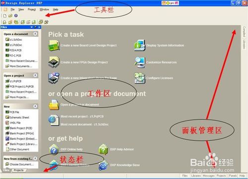 首先我們來(lái)認(rèn)識(shí)protel dxp的工作環(huán)境,分工作區(qū),面板管理和菜單、庫(kù)文件等等,如下圖所示