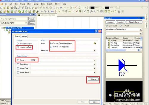 Search Criteria單元的Name文本框輸入*3904。 然后點(diǎn)Search那么Results顯示一個(gè)找到的庫(kù)。選擇Miscellaneous Devices.IntLib,點(diǎn)擊Install Library按鈕加載庫(kù),然后關(guān)閉Search Libraries對(duì)話框回到原理圖主界面。