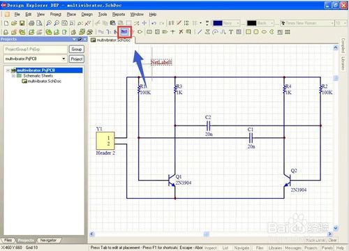 下面我們開始連接電路,點(diǎn)擊菜單的Place?Wire連線,點(diǎn)擊菜單Place?Net Lable放網(wǎng)絡(luò)標(biāo)號(hào),相同網(wǎng)絡(luò)標(biāo)號(hào)是等效點(diǎn),按tab可以調(diào)出Net lable的屬性框。然后保存原理圖。