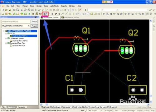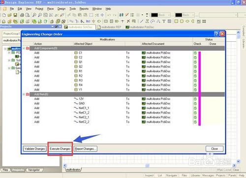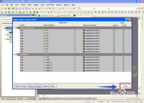 下面開始繪制PCB布線圖,可以利用向?qū)е苯訉?dǎo)入原理圖,打開原理圖,點(diǎn)擊菜單Design\Update PCB(Multivibrator.PcbDoc)Engineering Change Order對(duì)話框出現(xiàn)。