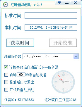 您只需要連接網(wǎng)絡(luò),不論是自動(dòng)還是人工校時(shí),都由軟件自動(dòng)選擇時(shí)間服務(wù)器自動(dòng)校準(zhǔn),相信您一定會(huì)喜歡它的^_^特點(diǎn):可設(shè)置成開機(jī)自動(dòng)啟動(dòng)啟動(dòng)后自動(dòng)校準(zhǔn)校準(zhǔn)后自動(dòng)退出。一切自動(dòng)化。(特別適合那些時(shí)間老是不準(zhǔn)或因主板電池問題時(shí)間不準(zhǔn)的用戶)【更新日志】