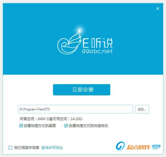 解壓在本站下載的e聽說安裝包,找到并雙擊“.exe”文件,進(jìn)入安裝向?qū)?br />安裝向?qū)J(rèn)為我們勾選了我已閱讀并同意軟件許可協(xié)議。點(diǎn)擊快速安裝就可以開始安裝軟件