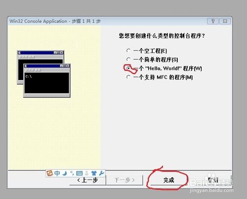 接著選擇”一個(gè)Hello,world簡(jiǎn)單程序“,單擊”完成“,