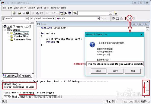 點(diǎn)編譯后底部"組建"框里提示有1個(gè)錯(cuò)誤,滾輪上劃查看錯(cuò)誤詳情為:Compiling...Error spawning cl.exe,導(dǎo)致無(wú)法成功編譯,此時(shí)按F5運(yùn)行會(huì)彈窗"This file does not exist, Do you want to build it?"。