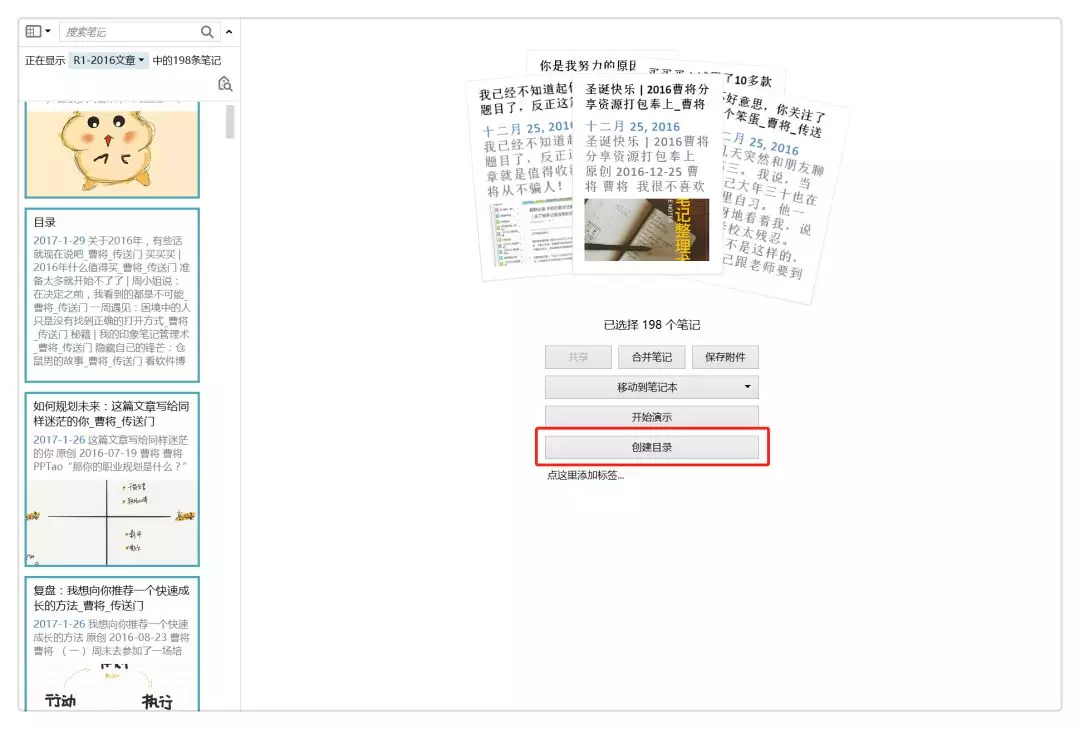 不過,擁有了很多跟同一個(gè)主題相關(guān)的筆記時(shí),你可能需要一個(gè)目錄,方便以后查看。比如,最近你在重點(diǎn)提高自己的英語能力,收藏了很多英語學(xué)習(xí)相關(guān)的信息,這時(shí)候就可以使用『筆記目錄』功能,一鍵創(chuàng)建目錄: