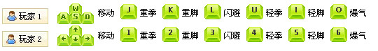 玩家1:鍵盤(pán)WASD鍵控制移動(dòng),J鍵攻擊,K鍵跳躍。組合鍵:J+K 特技(損血),S+W+J 大招,S+K 沖刺/滾動(dòng),W/S+J 扔人(需抓到人)。