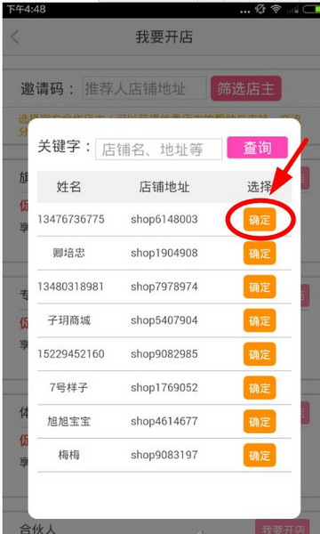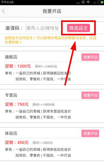 進入到我要開店的流程中,你必須要要選擇一個合作的店主,選擇官方合作的店主,可以獲得優(yōu)秀店主的幫助,分享交流經驗等,如果你已經有店主的店鋪ID,可以直接輸入,沒有推薦人的話,直接點擊“篩選”按鈕!不點是不能進行下一步的!