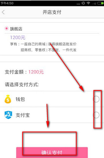 然后就需要進行支付了,比如旗艦店的支付金額是1200元,享受一座自己的商城、獲得旗艦店批發(fā)價,招商權、零售權、不囤貨、一件代發(fā)的特權,可以選擇支付寶支付,也可以是精選速購中的錢包支付,確認支付以后就可以去大禮自己的店了!