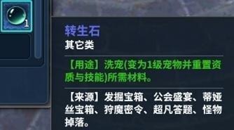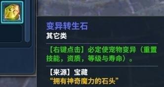 其中,轉(zhuǎn)生石比較容易獲得,用于重置寵物的資質(zhì)和技能。而變異轉(zhuǎn)生石則比較稀有,參與一些特殊活動才可以獲得,作用則與其稀有性相一致——洗練寵物并且必定使其變異!